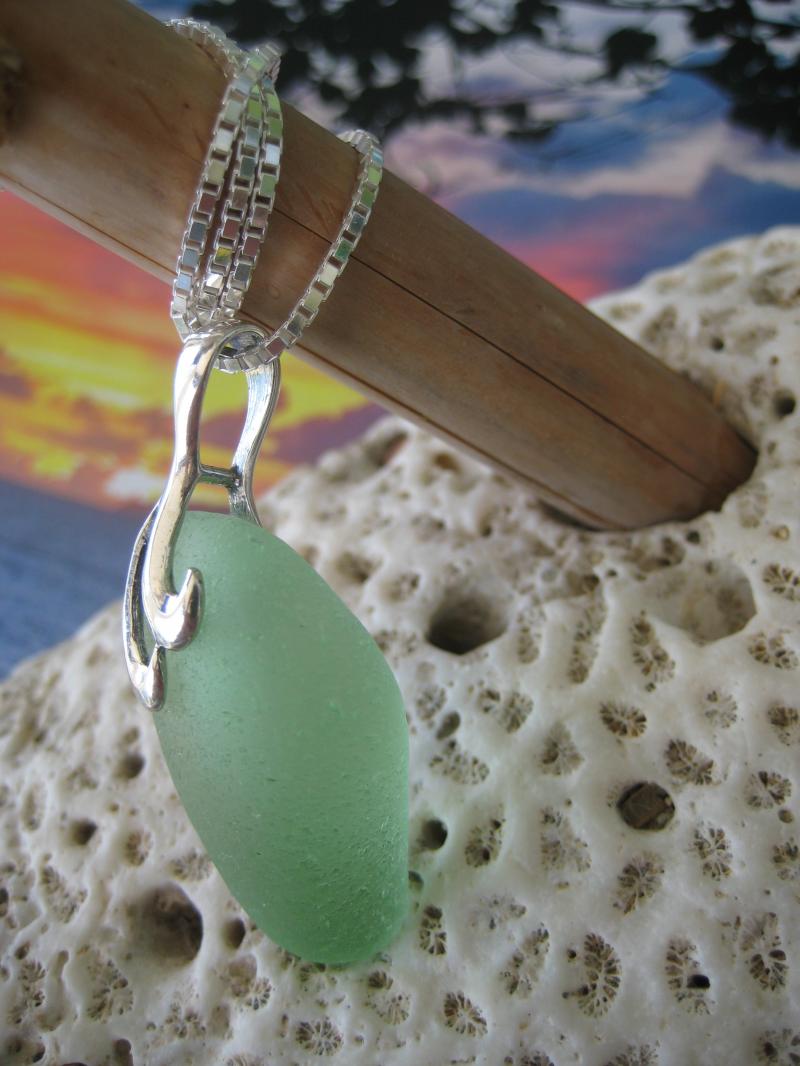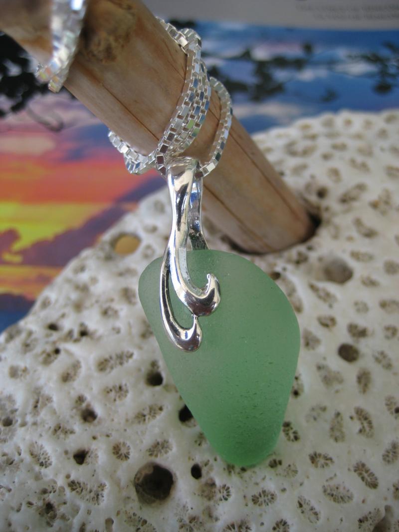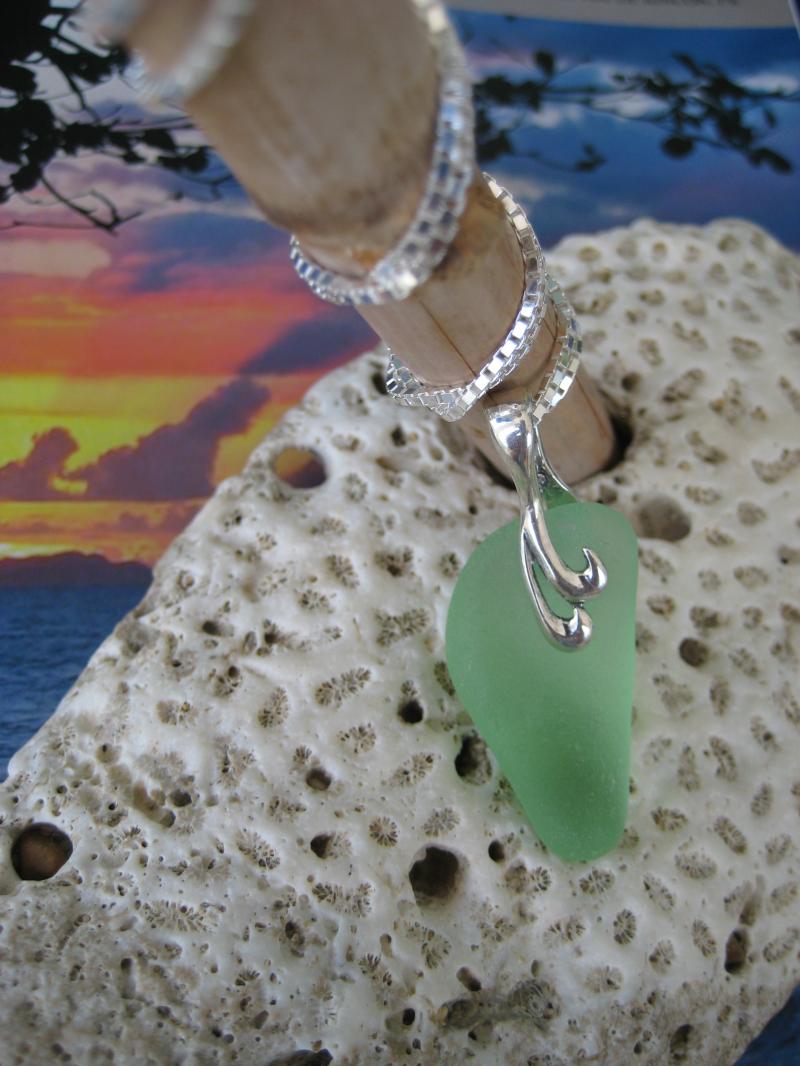 This rare light green piece has interesting dimention to it, which makes it really special to look at. The sterling bail is reversable, so you can wear the piece any side out you like. Very well finished with a 20" sterling box chain. A very nice pick.